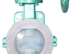 襯氟對夾蝶閥可承受"除熔融堿金屬和元素氟"外的任何介質(zhì)腐蝕。全襯里型對夾式蝶閥,采用對分兩片閥式組合,閥座與閥體內(nèi)襯一體化,閥門工作時,只有全塑閥座與襯塑蝶板與介質(zhì)接觸, D71F46閥桿和蝶板(鍛)為一體,表面均勻包裹一層FEP.閥體通道內(nèi)表面光滑,流體阻力小, 額定流量系數(shù)值高,流通能力強,扭矩適中,采用四級密封結(jié)構(gòu)并在密封面處配以耐溫抗老化SI橡膠的彈性襯墊閥座,完全達到介質(zhì)的零泄露。