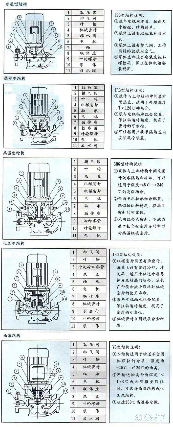 ISG型單級單吸管道離心泵,供輸送清水及物理化學(xué)性質(zhì)類似于清水的其他液體之用,適用于工業(yè)和城市給排水、高層建筑增壓送水、園林噴灌、消防增壓、遠距離輸送、暖通制冷循環(huán)、浴室等冷暖水循環(huán)增壓及設(shè)備配套,使用溫度T<80℃。
