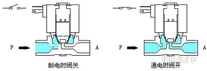 Electricity, the electromagnetic coil to produce electromagnetic force to shut down from the seat lift, the valve open; Power, the electromagnetic force disappears, press on the seat, spring to close the valve closed.