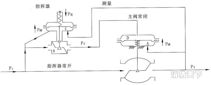 壓力P2增加時,首先作用在調壓閥A室,使調壓閥閥芯上移,調壓閥關閉,閥后壓力減小(初調)。同時,進入指揮器測量室C室壓力也增加,使指揮器關閉,作為能源使用的壓力P1經指揮器閥芯節流阻力增加,Ps減小,此壓力進入調壓閥D室,壓力相應減小,調壓閥進一步關小,閥后壓力繼續減小(精調)。故在指揮器型調壓閥二次調壓過程后,調壓精度較通常的調壓閥高。