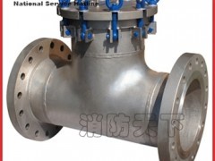 快開T型過(guò)濾器主要由三通、法蘭、吊環(huán)快開盲板上蓋和過(guò)濾網(wǎng)等組成,法蘭通過(guò)電焊工藝焊裝在三通的管口上組成殼體,殼體頂部通過(guò)法蘭固定有快開盲板上蓋,并在其之間設(shè)置有密封O型圈,盲板蓋上設(shè)置固定鎖環(huán),固定鎖環(huán)上通過(guò)螺紋連接有固定吊環(huán),吊環(huán)快開盲板上蓋與殼體之間設(shè)置有濾網(wǎng),當(dāng)流體進(jìn)入置有一定規(guī)格過(guò)濾網(wǎng)后,其雜質(zhì)被阻擋,而潔凈的介質(zhì)則由過(guò)濾器出口排出,當(dāng)需要清洗時(shí),只要按絲杠處螺紋的方向轉(zhuǎn)動(dòng)吊環(huán),直至法蘭與盲板蓋完全分開,拉動(dòng)盲板蓋上的拉手移走上蓋,將可拆卸的濾網(wǎng)取出,清洗或更換后重新裝入即可,盲板上蓋關(guān)閉前應(yīng)徹底清除密封面、密封槽和O型密封圈及法蘭上的污物,并涂抹防銹油脂。