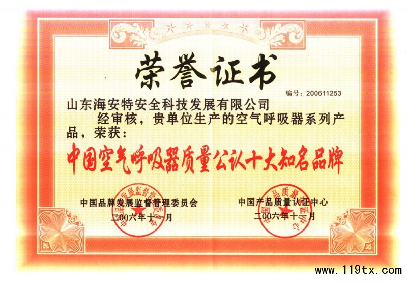 » 空氣呼吸器榮譽(yù)證書(shū)
