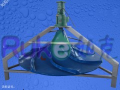 在市政、化工造紙及其它多種水處理工藝中,水體攪拌混合是其中關鍵工藝過程之一。傳統的攪拌機械分為立軸折槳式和水平(潛水)式兩種常用方式,由于安裝的方式和葉槳形式決定了其攪拌形態,無論在能耗上還是在攪拌效果上均不太理想,不僅給污水廠的運營成本帶來不必要的增加,而且會直接影響到最終的工藝處理效果。針對以上問題,經過四年的試驗,借助同行的設計經驗,我們終于研制成功具有自主知識產權的具有雙層葉輪的曝氣攪拌裝置.