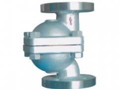 立式自由浮球式蒸汽疏水閥的結構簡單,內部只有一個精細研磨的不銹鋼空心浮球,既是浮子又是啟閉件,無易損零件,使用壽命很長。裝置剛起動時,管道內出現空氣和低溫冷凝水,雙金屬自動排空氣元件把浮球推離閥座,閥門打開,排除不凝結氣體,低溫冷凝水流進疏水閥,浮球上升,凝結水迅速排放。裝置很快提升溫度,管道內溫度上升到飽和溫度之前,雙金屬自動排空氣元件感溫變型伸直;蒸汽疏水閥進入正常運行狀況,浮球隨液位升降調節閥孔流量;當凝結水停止進入時,浮球隨介質流向逼近閥座,關閉閥門。立式自由浮球式蒸汽疏水閥的閥座總處于液位以下,形成水封,無蒸汽泄漏。