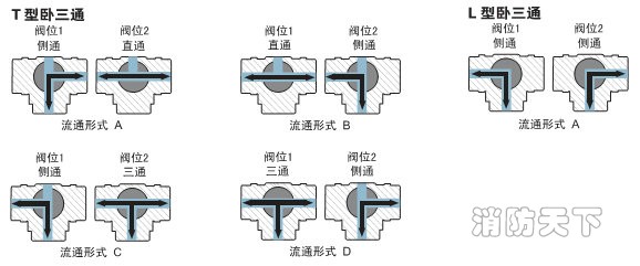 2.兩閥座密封電動三通球閥具有結構緊湊、外形美觀、密封性能好,它能實現對管道中介質流向的切換。也能使相互垂直的兩個通道連通或關閉(如流向下圖A)。