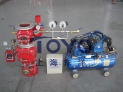 當有關(guān)人員接到火災(zāi)報警控制器發(fā)出的報警信號或聽到水力警鈴聲響后,及時組織人員將火撲滅,閉式噴頭就不會打開噴頭,避免了水漬造成的損失?;馂?zāi)撲滅后,應(yīng)將雨淋閥關(guān)閉,并排空管路中的水,使系統(tǒng)充氣,恢復(fù)伺應(yīng)狀態(tài)。充氣壓力為0.03-0.05Mpa范圍內(nèi),充氣量不小于0.10m/min,以確保在30min內(nèi)完成對將官網(wǎng)的充壓。由空氣維護裝置、預(yù)作用控制柜和空氣壓縮機組成連鎖裝置控制,對管網(wǎng)充氣的作用是監(jiān)測系統(tǒng)管路的工作情況,管路及噴頭是否損壞和泄漏,當管路損壞或大的泄漏時,系統(tǒng)中氣壓低于0.01Mpa時,就會發(fā)出故障報警信號(詳見預(yù)作用滅火系統(tǒng)原理圖、預(yù)作用系統(tǒng)動作原理圖)。