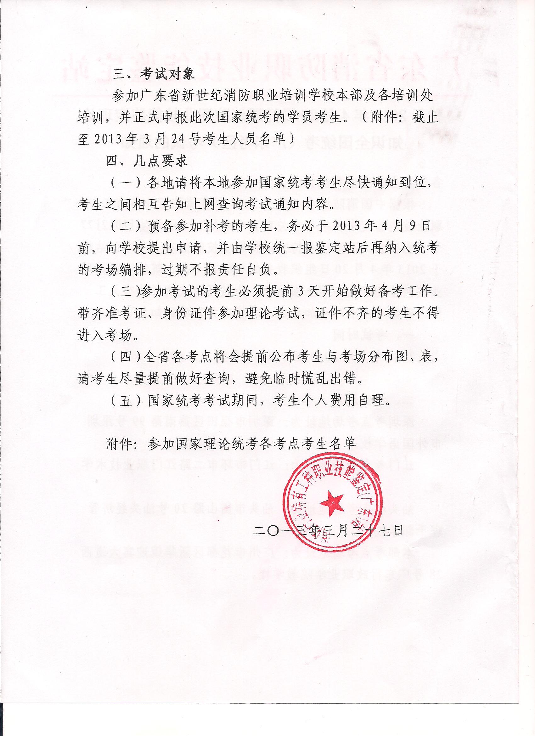 參加廣東省新世紀消防職業培訓學校本部及各培訓處培訓,并正式申報此次國家統考的學員考生。(附件:截止至2013年3月24號考生人員名單)