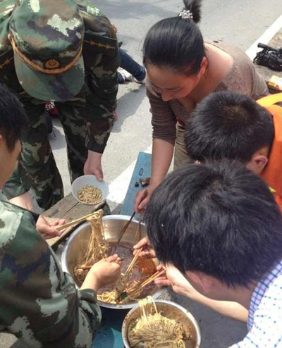 消防天下網訊 行進途中,沿途群眾自發組織起來,給消防官兵送水,煮面,軍民魚水情在這一刻是這樣的感人和溫馨。