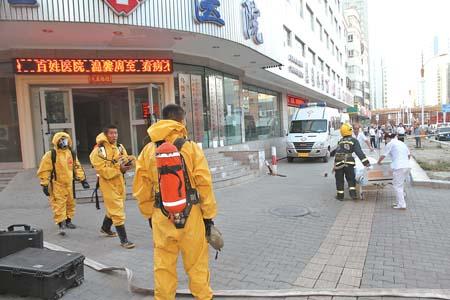 記者在現場看到,消防人員在醫院周圍約一百米處拉起了警戒線,并對行人進行疏散。