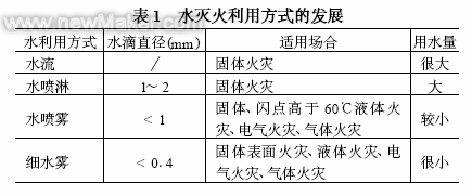 自古以來,人們就懂得用水撲滅火災(zāi)。“水火不相容,水火相克”遠(yuǎn)古時(shí)代就人所共知,因此,說水是人類最早應(yīng)用的滅火劑,隨著人類社會(huì)的發(fā)展,科技的進(jìn)步,火災(zāi)種類和形式發(fā)生了很大的變化,人類利用水來滅火的方法也相應(yīng)的向前發(fā)展。水滅火利用方式的發(fā)展見表1。