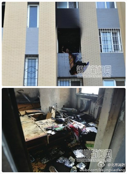 7月29日下午3時許,銀川市金鳳區平伏橋新村小區15號樓1單元4樓一住戶家中起火,窗戶玻璃、燈具都被燒爆,床鋪、桌椅等家具被燒毀。