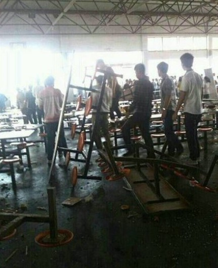 上千名學(xué)生從學(xué)校東大門開始,依次將食堂、超市、教室、西門、寢室設(shè)施砸毀,并圍毆了學(xué)校一名主任,當(dāng)?shù)鼐斓綀龊笠矝]敢下車,直至學(xué)校作出讓步。