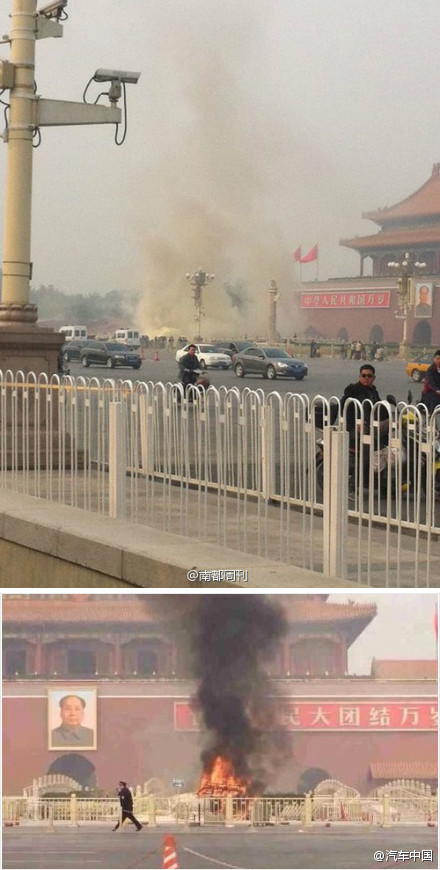 今天12時(shí)05分許,一輛吉普車由南池子南口拐入長(zhǎng)安街便道,由東向西行駛撞向金水橋護(hù)欄后起火,行駛過(guò)程中造成多名游客及執(zhí)勤民警受傷。