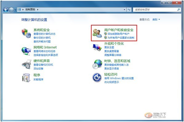 “控制版面”中選擇“用戶帳戶和家庭安全
