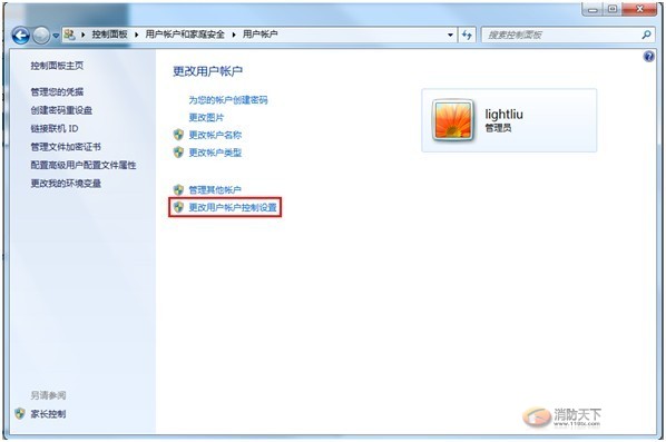 用戶帳戶”選擇“更改用戶帳戶控制設置”