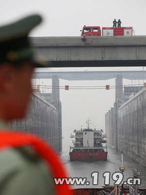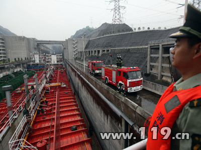 5月21日上午9時,共載有近一萬噸汽油的6艘危險品船舶欲通過三峽船閘前往重慶,為防止發生安全事故,三峽壩區特勤消防派出15名官兵,分別在閘室兩岸和船舶上巡查布控,歷時4小時安全將船舶送出船閘。據大隊長王武量介紹,三峽消防大隊平均每天都要執行一次護航任務,建隊10年來,累計護送7480余艘危化品船舶、1210萬噸危化品安全通過船閘,實現船舶護航“零事故”。