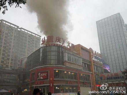 肯德基樓上的重慶火鍋店樓頂冒出陣陣濃煙,不見明火。