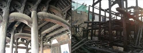 “諸葛、長樂村民居”之長樂村望云樓:火災(zāi)致使占地380平米的望云樓全部燒毀,毗鄰文物建筑——象賢廳和滋樹堂(均為國保組成部分)的部分山墻受到損傷。