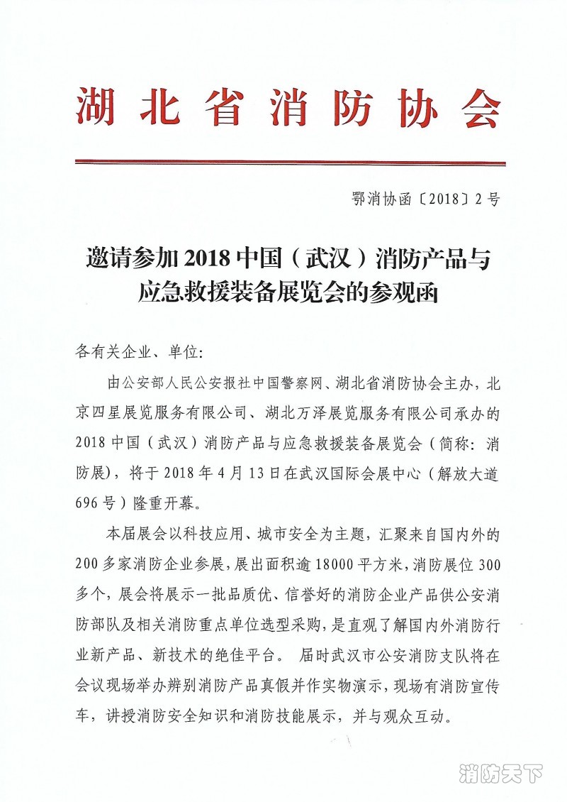 邀請參與2018中國(武漢)消防產品與應急救援裝備展覽會的參觀函