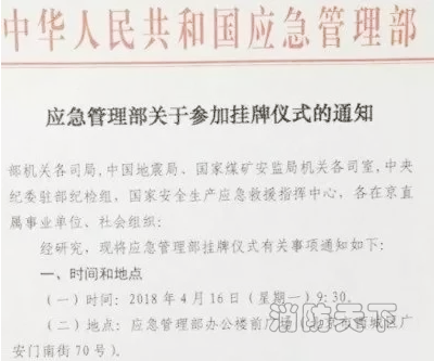 核心提示:掛牌時間:2018年4月16日(星期一)9:30。掛牌地點:應急管理部辦公樓前廣場(北京市西城區廣安門南街70號)。早在半個月前,消