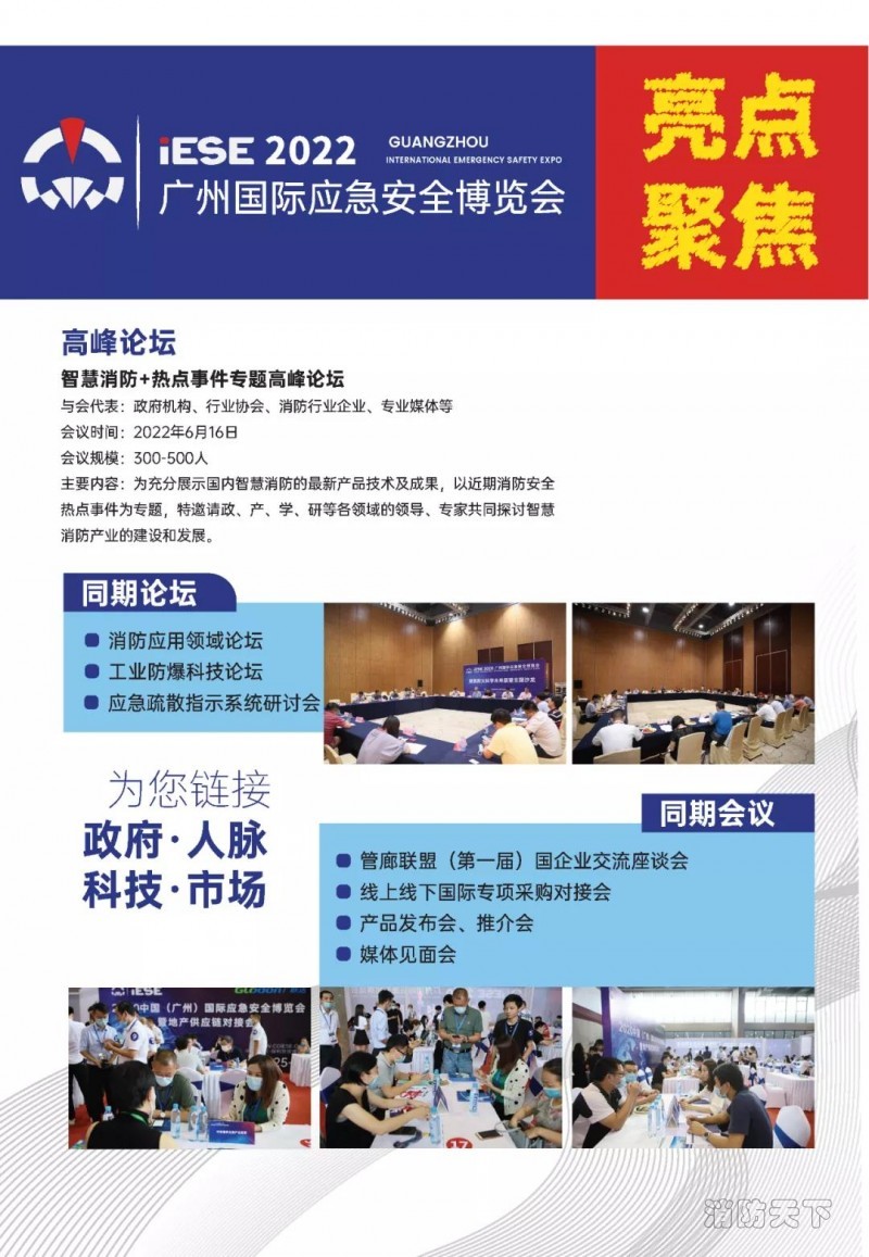 由廣東省應急管理廳、廣東省工業和信息化廳等部門指導,中國機械工業集團有限公司、廣東省應急管理服務協會、廣東省應急協會、廣東省消防協會、廣東省應急產業協會、中國安全產業協會消防技術創新專委會、管廊聯盟等機構共同組織的廣州國際應急安全博覽會(IESE)定于2022 年6月16—18日在廣州保利世貿博覽館隆重舉行。
