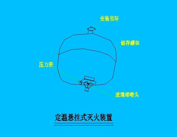 (1)定溫懸掛式滅火系統。不用安裝自動報警控制系統,當室內溫度到達68℃時,感溫元件自動爆破,滅火劑自動噴放到防護區實施滅火。
