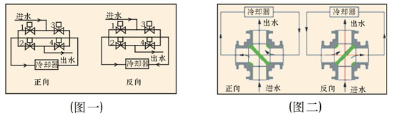 該四通換向球閥,一 閥實現(xiàn)正反供水切換,每轉90 ,供水方式切換一次,以前需四個閥門,供水時閥1、4 開啟,閥2、3關閉;反向供水時閥2、3開啟,閥1、4 關閉(圖一),現(xiàn)用一臺四通球閥(圖二)替代,操作方便。