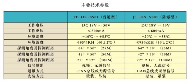 JT-HS-SS01型雙波段圖像型火災(zāi)探測器(或防爆型)是我公司最新推出的一種高科技火災(zāi)智能探測產(chǎn)品,該產(chǎn)品采用了最新的DSP圖像分析處理技術(shù)、工業(yè)級CAN總線通訊技術(shù)等高新技術(shù),能有效探測到火災(zāi),且能有效排除日光、燈光以及車燈等干擾源的干擾;該產(chǎn)品具有探測距離遠(yuǎn)、探測角度廣、抗干擾能力強等優(yōu)點,可廣泛用于各種室內(nèi)、室外的遠(yuǎn)距離火災(zāi)探測,且具有防爆隔爆功能。