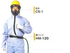 HM-12送風長管呼吸器,日本重松長管呼吸器(SV-1)視野寬、帶著舒適,與面部有雙層接觸,能保持高度的氣密性。腰帶上裝有風量調節閥,使用者可自己調節風量。電動送風機內裝有高性能機械過濾器,即使在有粉塵存在的場所,亦可使用。1臺電動送風機可同時供4人使用。裝有5速變速轉換擋位,可根據管長和使用人數變換擋位,來調整送風量。空氣溢出方式設計,即使1人使用,也不會燒電機。