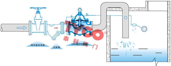 TY-100X遙控浮球閥工作原理 當管道從進水端給水時,由于針閥、球閥、浮球閥是常開的,水通過微型過濾器、針閥、控制室、球閥、浮球閥進入水池,此時控制室不形成壓力,主閥開啟,水塔(池)供水。 |