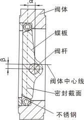 | 蝶板的回轉中心(即閥桿的中心)與蝶板密封截面偏置一個尺寸α,并與閥體通道軸線偏置一個尺寸β。 當雙偏心蝶閥處全開狀態時,其蝶板密封面會完全脫閥座密封面,形成一個間隙γ,使蝶板的回轉半徑分為長半徑和短半徑,在長半徑轉動的大半圓上,蝶板密封面轉動軌跡的切線會與閥座密封面形成一個θ角,在閥門啟閉時,蝶板密封面相對閥座有一個漸出脫離和漸入擠壓的作用,從而降低了啟閉時蝶板和閥座之間的機械麻損和擦傷。 |