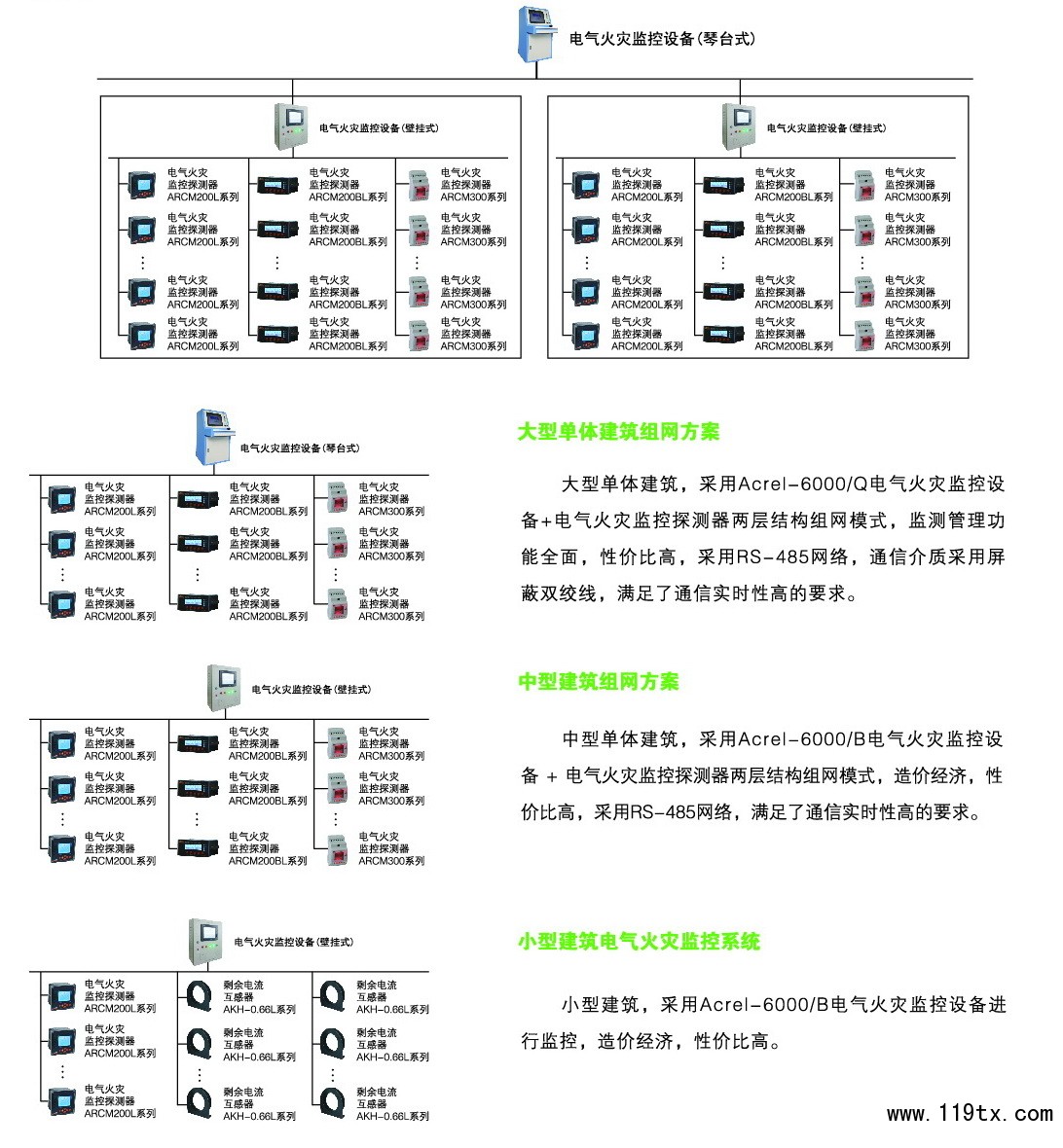 大型建筑群,樓層高,多棟樓體分散。采用Acrel-6000/Q電氣火災監控設備 + Acrel-6000/B電氣火災監控設備 + 電氣火災監控探測器三層結構組網模式,便于區域化管理,采用RS-485網絡通信,以太網通信,滿足了通信實時性高的要求。