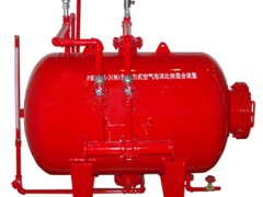 泡沫比例混合裝置主要有罐體、膠囊、比例混合器、進水管路、出液管、排水閥、排污閥、安全閥、壓力表組成。每個管路均安裝有閥門、進水管線上裝有壓力表,膠囊裝在罐體內,其內腔和罐腔是各自獨立的。它是用來儲存泡沫滅火劑,并通過壓力式比例混合器的作用,將消防供水置換裝置內儲存的泡沫滅火劑,并與供水按一定的比例混合形成泡沫混合液的裝置。按儲罐的結構形式分為:臥式比例混合裝置和立式比例混合裝置;按比例混合器的個數分為:單比例混合器混合裝置和多比例混合器,單比例混合器為常規的比例混合器。