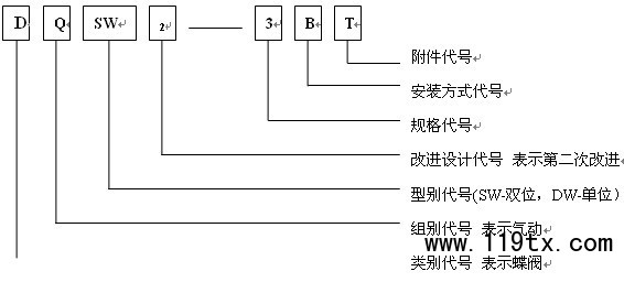 DQSW2 — 3BT表示經第二次改進的、帶氣源三聯件的、通徑為¢175的、水平安裝的氣動雙位蝶閥。
