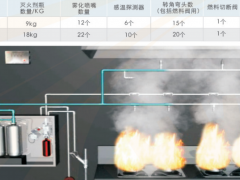 廚房灶臺油鍋發生火情時,火焰發出的巨大熱量使易熔金屬感溫器動作,平時灶臺熱量達不到感溫元件動作的溫度不會造成誤噴,傳遞探測信號給控制盤,輸出啟動信號,啟動驅動閥,驅動氣體進入滅火劑瓶組,將滅火劑通過虹吸管送出,通過霧化噴嘴噴出,覆蓋在油鍋表面,迅速將火撲滅。同時滅火劑通過排煙罩噴嘴,煙道噴嘴噴灑在排煙罩,煙道內撲滅火焰,待滅火劑噴放完畢后,通過水流閥機構繼續給灶臺油鍋及煙道降溫,保證滅火效果和不復燃。