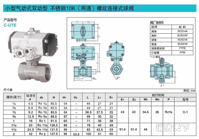 日本KITZ北澤C-UTE不銹鋼氣動球閥結構合理、造型美觀。閥座采用彈性密封結構,密封可靠,啟閉輕松。閥桿采用倒密封的下裝式結構,閥腔異常升壓時,閥桿不會被沖出。
