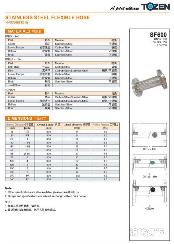 TOZEN SF600不銹鋼金屬軟接頭是一種柔性耐壓管件安裝于液體輸送系統(tǒng)中,用以補(bǔ)償管道或機(jī)器、設(shè)備連接端的相互位移,吸收振動(dòng)能量,能夠起到減振、消音等作用,具有柔性好、質(zhì)量輕、耐腐蝕、抗疲勞、耐高低溫等多項(xiàng)有點(diǎn)。