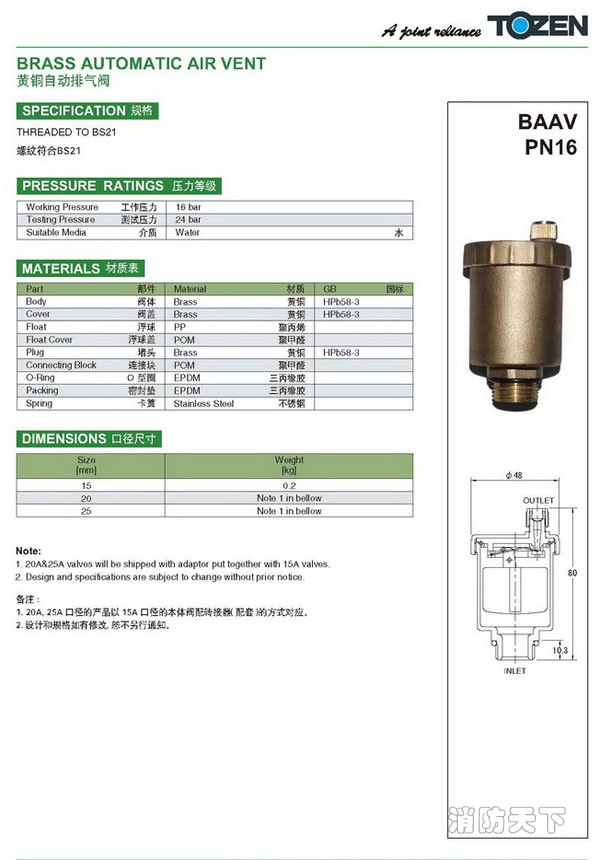 TOZEN黃銅自動排氣閥設計規范: