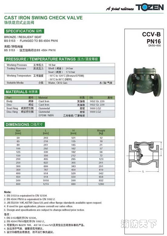 TOZEN CCV-B鑄鐵旋啟式止回閥主要適用于臥式安裝的給排水系統(tǒng),可安裝于水泵出水口處,以防止倒流及水錘對泵損害。