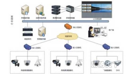 安裝在前端的攝像機把圖像信號攝入后,視頻信號經視頻編碼器轉換為IP網絡信號,通過以太網的傳輸方式送至監控中心。視頻壓縮格式為標準H.264,壓縮分辨率不低于720P,海量存儲設備掛在局域網上,內部的授權電腦可通過局域網遠程查看錄像資料,并可以截取或備份,錄像資料保存的時間為30天;所有數字圖像傳輸到數字解碼器,數字圖像經過數模轉換后上電視墻。