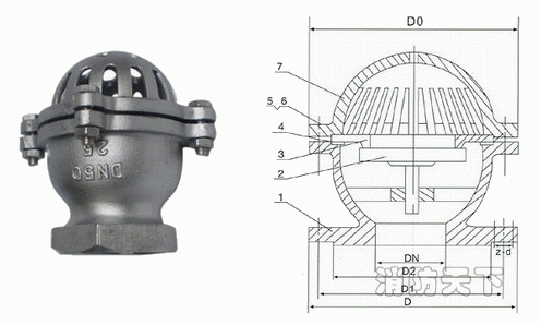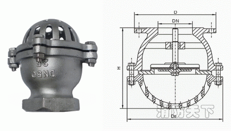 底閥由閥體,閥瓣,閥蓋,襯套,密封圈等零件組成,詳見下圖水源的水從閥蓋進入閥體。在流體的壓力作用下,閥瓣打開水,當示停后出口管內的壓力將閥瓣迅速關閉,液體將不會倒回水源,起到了即暢通抽水又節約水能損失的作用。