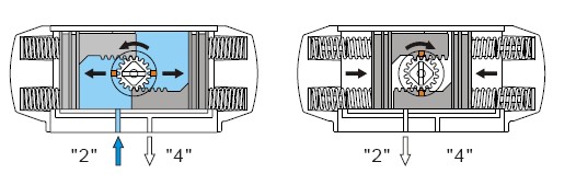 當氣源壓力從氣口(2)進入氣缸兩活塞之間中腔時,使兩活塞分離向氣缸兩端方向移動,迫使兩端的彈簧壓縮,兩端氣腔的空氣通過氣口(4)排出,同時使兩活 塞齒條同步帶動輸出軸(齒輪)逆時針方向旋轉。在氣源壓力經過電磁閥換向后,氣缸的兩活塞在彈簧的彈力下向中間方向移動,中間氣腔的空氣從氣口(2)排 出,同時使兩活塞齒條同步帶動輸出軸(齒輪)順時針方向旋轉。(如果把活塞相對反方向安裝,彈簧復位時輸出軸即變為反向旋轉)