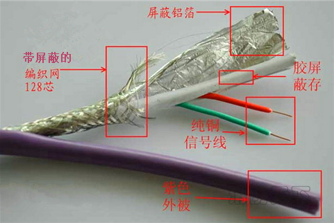 2、鋁箔、裸金屬絲編織雙層屏蔽,PVC外護套,阻燃,外觀紫色。