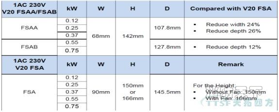 目前,電壓等級(jí)為AC220V的V20產(chǎn)品FSA尺寸進(jìn)行了升級(jí),將該尺寸分為FSAA以及FSAB。