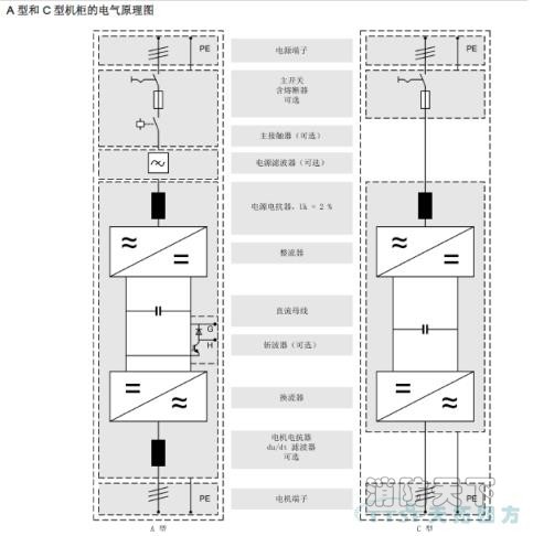 在 A 型變頻調速柜中可以安裝所有電源連接組件,例如:主開關、主接觸器、電源熔斷器、抗射頻濾波器或電機側的組件(如電機電抗器、含電壓峰值限制器的 dU/dt濾波器)以及附加的保護/監控設備。