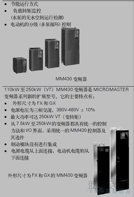 MICROMASTER 430 變頻器適合用于各種變頻驅(qū)動(dòng)裝置,由于其靈活性而可以在廣泛的領(lǐng)域得到應(yīng)用。這種變頻器尤其適合用于工業(yè)部門的水泵和風(fēng)機(jī)。變頻器的特點(diǎn)是設(shè)備性能面向客戶的需求,而且使用簡便。與MICROMASTER 420 變頻器相比,這種變頻器具有更多的輸入和輸出端,還具有經(jīng)過優(yōu)化的后手動(dòng)/自動(dòng)切換功能的操作面板,以及自適應(yīng)功能的軟件。